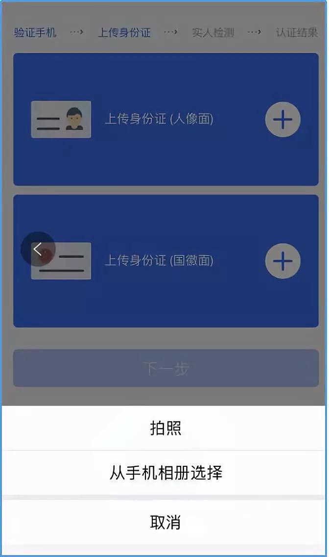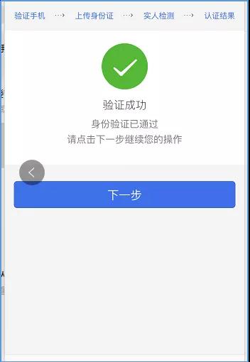 C.輸入需綁定的手機(jī)號(hào),獲取并輸入相關(guān)驗(yàn)證碼,完成手機(jī)驗(yàn)證。點(diǎn)擊“下一步”,跳轉(zhuǎn)至身份證驗(yàn)證界面,通過拍照或從手機(jī)相冊(cè)選擇相對(duì)應(yīng)的身份證照片上傳,上傳成功核實(shí)無誤后,點(diǎn)擊“下一步”進(jìn)入“實(shí)人檢測(cè)”。