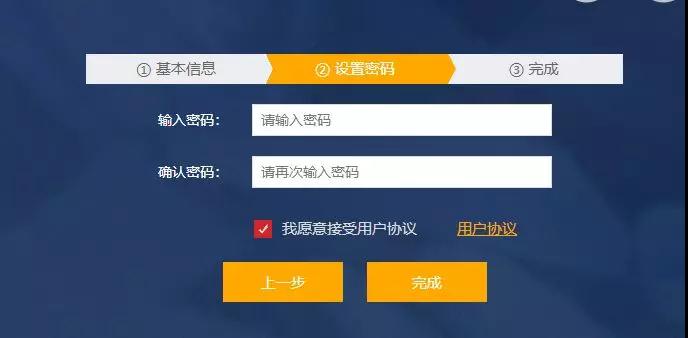 F. 設(shè)置密碼(密碼必須由8-16位字符或數(shù)字組成),勾選用戶協(xié)議,點(diǎn)擊完成,即完成用戶注冊(cè)。