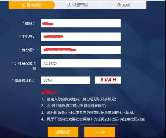 F.補(bǔ)充相關(guān)信息。用戶需輸入“社會(huì)保障卡號(hào)”即社會(huì)保障卡卡面上的社會(huì)保障卡號(hào),如下圖紅色框內(nèi),錄入相關(guān)信息后按提示點(diǎn)擊“下一步”。