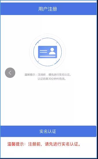 A. 點(diǎn)擊“用戶注冊(cè)”,進(jìn)入“用戶注冊(cè)”界面,進(jìn)行實(shí)名認(rèn)證,操作流程同上,詳見電腦端實(shí)名認(rèn)證(步驟C-F)。