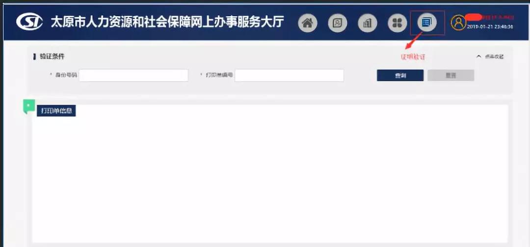 l 可通過在“太原人社網(wǎng)廳”內(nèi)證明驗(yàn)證模塊,輸入個(gè)人身份證號(hào)和打印單編號(hào)進(jìn)行驗(yàn)證。