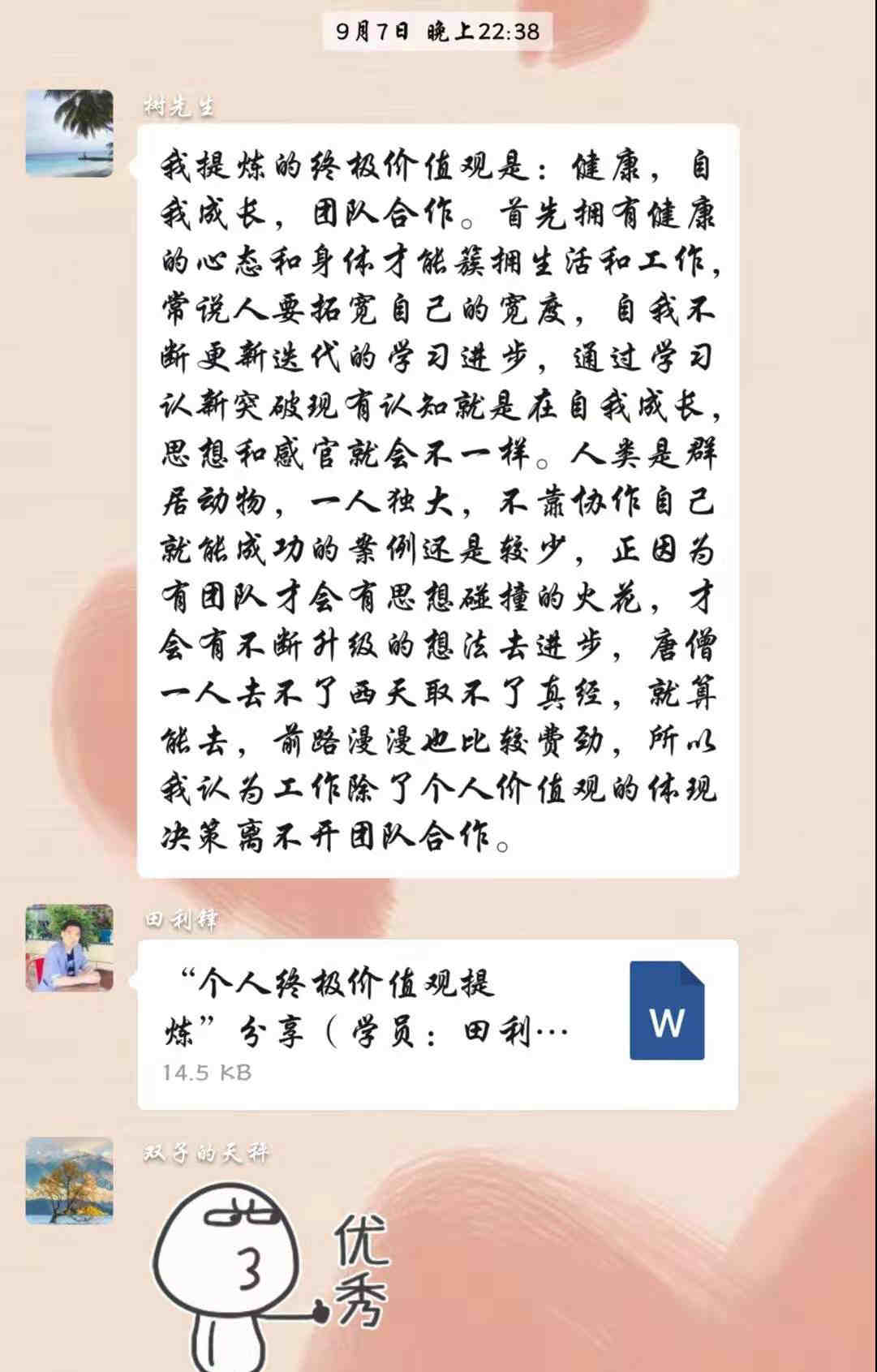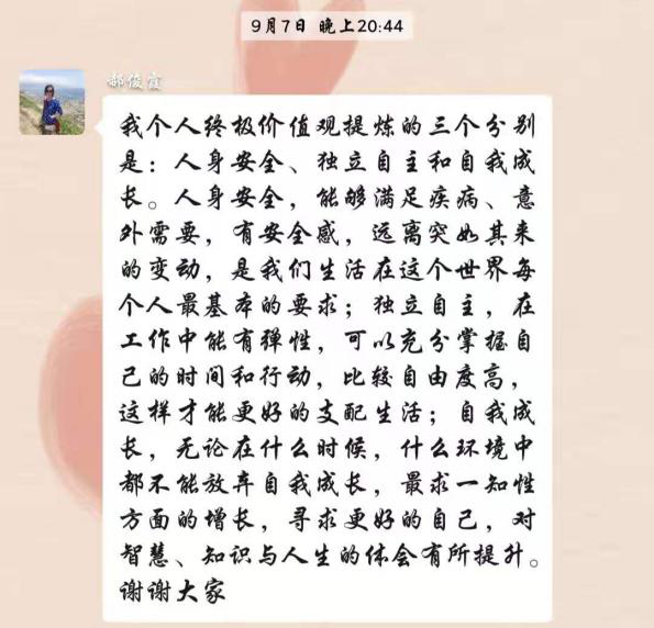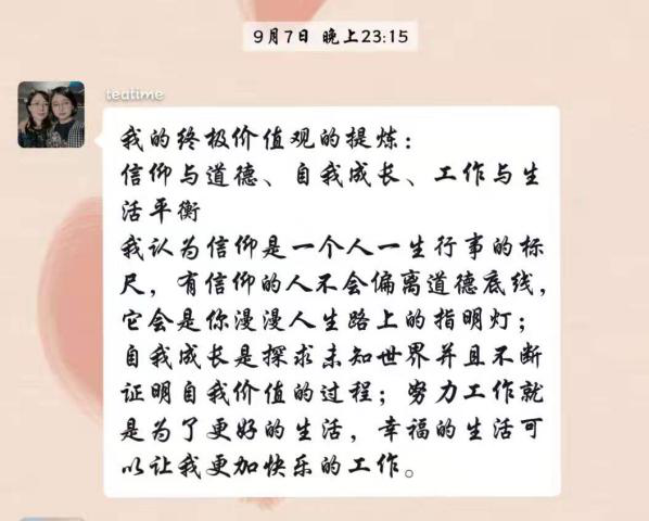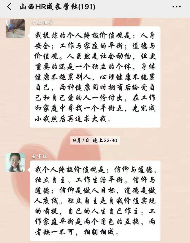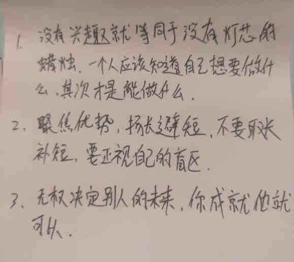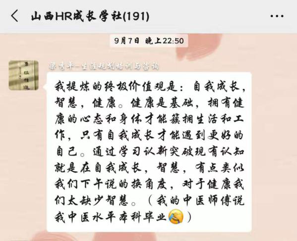 短暫的午間小憩后由明星學(xué)員杜春帶領(lǐng)著大家跳了一曲“蹦沙卡拉”,滿滿的激情與能量,各位學(xué)員再次滿血復(fù)活投入到了下午的課程當(dāng)中。性格、興趣、勝任能力都充分了解后,怎樣才能走向職業(yè)巔峰呢?緊接著又一波測(cè)試來襲——價(jià)值觀測(cè)試,36個(gè)價(jià)值觀重視程度的選擇,8個(gè)非常重視再次層層篩選,***后每位學(xué)員都得到了自己的3個(gè)******價(jià)值觀,果然一千個(gè)人心中會(huì)有一千個(gè)哈姆雷特,大家互相分享著自己的選擇,激烈的討論著自己的******價(jià)值觀,課后依然回味無窮。