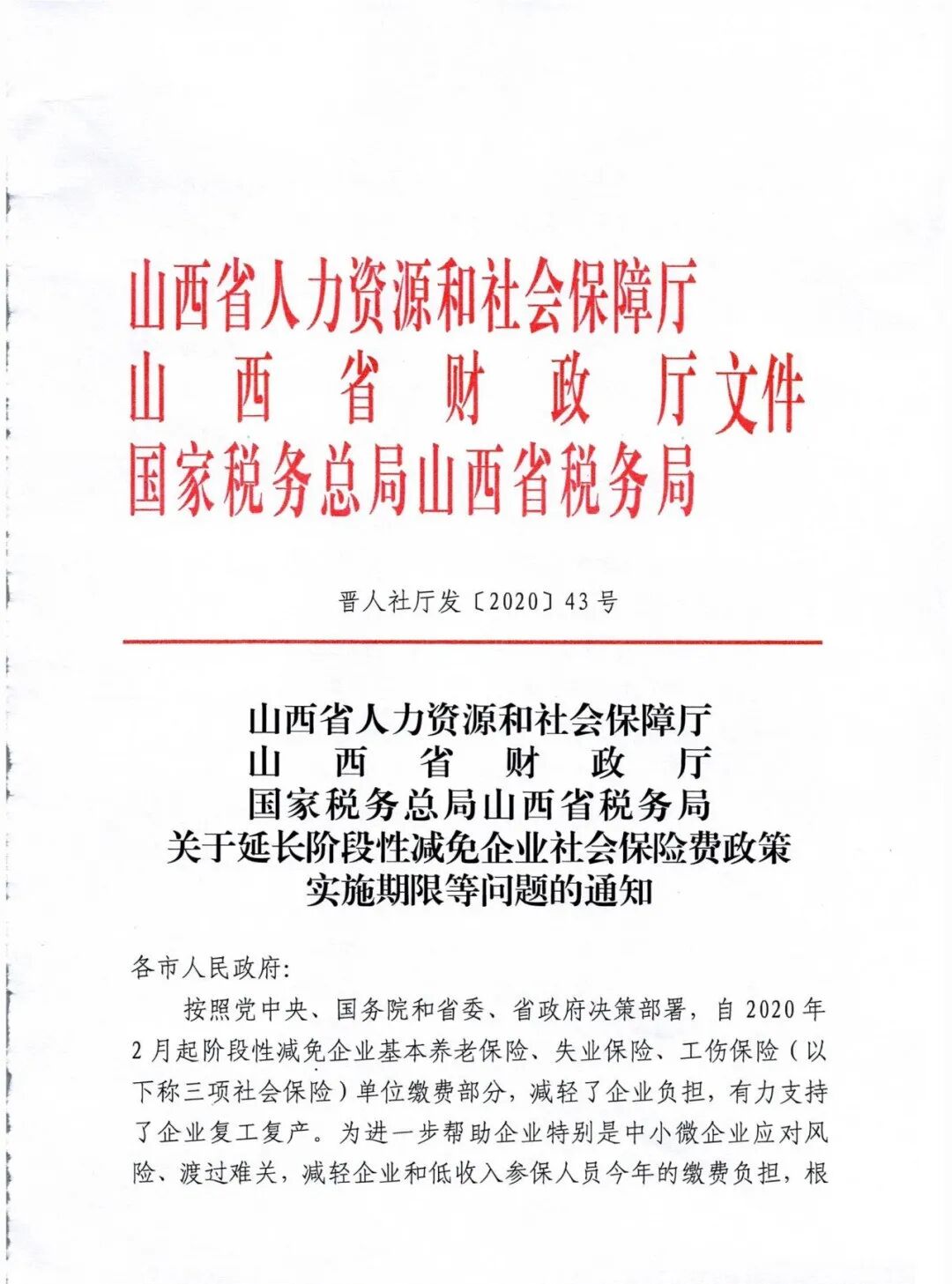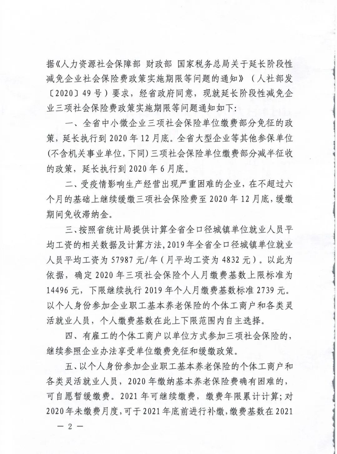 按照黨中央、國(guó)務(wù)院和省委、省政府決策部署,自2020年2月起階段性減免企業(yè)基本養(yǎng)老保險(xiǎn)、失業(yè)保險(xiǎn)、工傷保險(xiǎn)(以下稱三項(xiàng)社會(huì)保險(xiǎn))單位微費(fèi)部分,減輕了企業(yè)負(fù)擔(dān),有力支持了企業(yè)復(fù)工復(fù)產(chǎn)。為進(jìn)一步幫助企業(yè)特別是中小微企業(yè)應(yīng)對(duì)風(fēng)險(xiǎn)。渡過(guò)難關(guān),減輕企業(yè)和低收入?yún)⒈H藛T今年的繳費(fèi)負(fù)擔(dān),根據(jù)《人力資源社會(huì)保障部財(cái)政部國(guó)家稅務(wù)總局關(guān)于延長(zhǎng)階段性減免企業(yè)社會(huì)保險(xiǎn)費(fèi)政策實(shí)施期限等問(wèn)題的通知》(人社部發(fā)[2020] 49號(hào))要求,經(jīng)省政府同意,現(xiàn)就延長(zhǎng)階段性減免企業(yè)三項(xiàng)社會(huì)保險(xiǎn)費(fèi)政策實(shí)施期限等問(wèn)題通知如下: