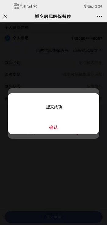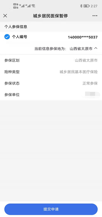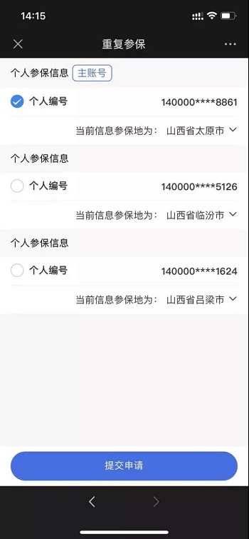 第五步 選擇確認(rèn)主賬戶參保信息后“提交申請(qǐng)”即可正常辦理醫(yī)保業(yè)務(wù)和享受醫(yī)保待遇。