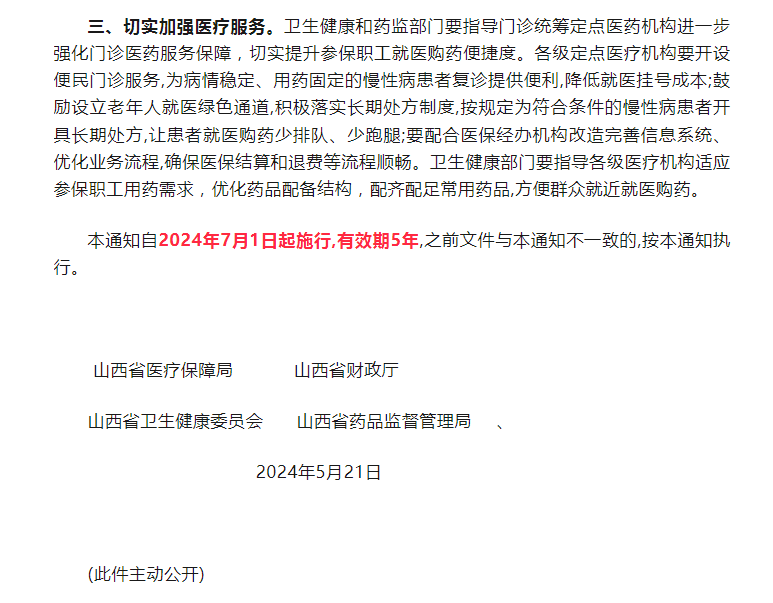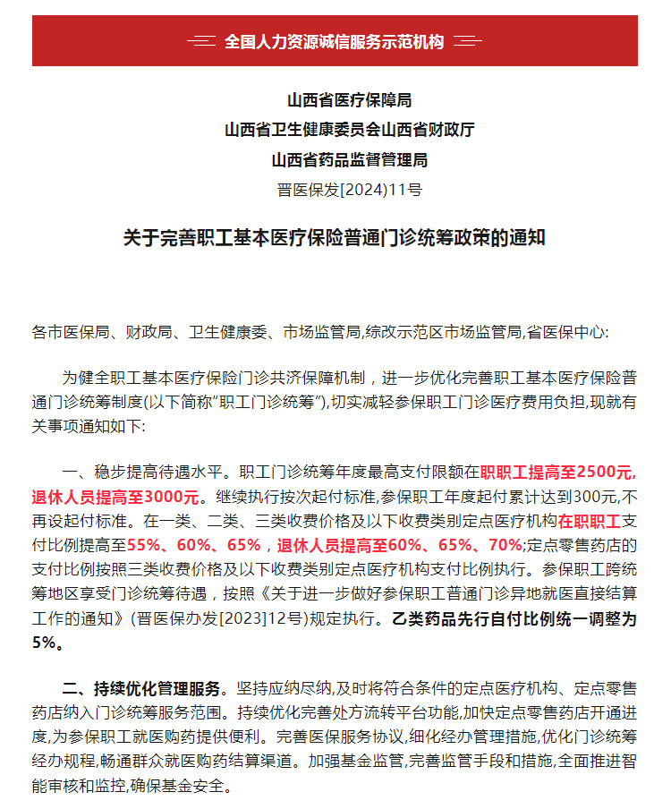 2024年7月1日起施行,完善職工基本醫(yī)療保險普通門診統(tǒng)籌政策:在職職工提高至2500元,退休人員提高至3000元。