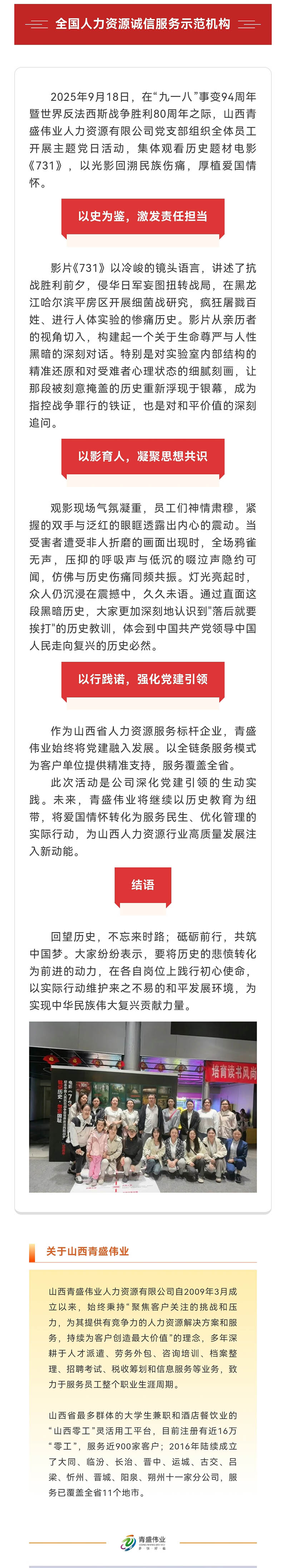 銘記歷史守初心黨建引領擔使命——山西青盛偉業(yè)人力資源有限公司開展“九一八”主題觀影活動